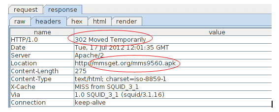 The app is downloaded through a “drive-by download” technique. When a subscriber clicks on the link hxxp://mmsget.org/9560.html using an Android browser the malware app is downloaded automatically without user intervention. The malware authors achieve this by configuring the server to send a HTTP 302 response to the browser that links to the malicious apk. This causes the browser to issue a GET request for the apk that is downloaded to the phone’s file system without the user’s consent.